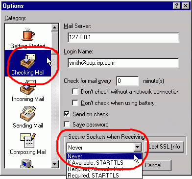 SpamWeasel Support Issues Eudora configuration 1 Click on Tools | Options. ![]() 2 The Options screen will appear, showing your current settings. ![]() 3 At the end of the "Login name" field, type an "@" sign, followed by the contents of the "Mail Server (Incoming)" field. Next, change the "Mail Server (Incoming)" field to "127.0.0.1". ![]() 4 Select the "Checking mail" option, in the left-hand pane. Then click on the drop-down menu with the title "Secure sockets when receiving", and select "Never". Click OK to apply the settings. ![]() Timeouts You may wish to change the timeout setting in your e-mail client. More information on why this may be required can be found here. To change the timeout settings, scroll down the list on the left-hand side, and select "Network". You can increase the timeout setting here. ![]() |