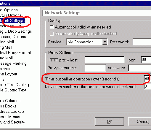 SpamWeasel Support Issues Pocomail configuration 1 Click on Tools | Acounts Setup. ![]() 2 On the screen that appears, select your account from the left-hand pane, and this will show your current settings. ![]() 3 At the end of the "Username" field, type an "@" sign, followed by the contents of the "POP/IMAP Server" field. Next, change the "POP/IMAP Server" field to "127.0.0.1". Click OK to apply the settings. Note: Make sure that the "Use Authentication" box to the right of the SMTP Server field is not checked. ![]() Timeouts You may wish to change the timeout setting in your e-mail client. More information on why this may be required can be found here. To change the timeout settings, click on Tools | Options. ![]() ... Select "Network Settings" from the left-hand side. You can increase the timeout setting here. ![]() |