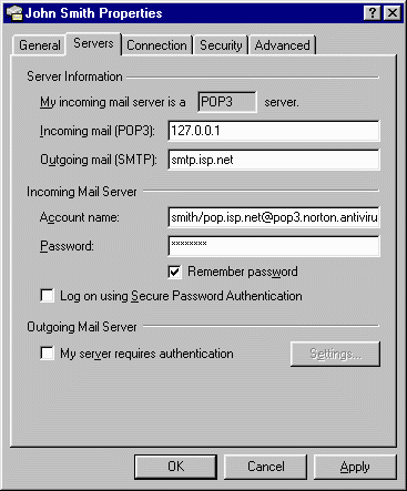SpamWeasel Support Issues Q. How can I get SpamWeasel to work with Norton Anti-Virus? A. If you are using Norton Anti-Virus 2002 then this should work with SpamWeasel without any extra configuration. However, Norton Anti-Virus 2001 works in a similar way to SpamWeasel, listening on the POP port and intercepting incoming mail before it's delivered to your e-mail client. As only one application can listen on a port at any one time, you will need to change the port SpamWeasel listens on so that the two products can form a relay: Your e-mail client sends a POP collection request to SpamWeasel, SpamWeasel sends the request to Norton AV, and Norton requests the collection from your ISP. The mail will be passed back through Norton AV and SpamWeasel to your e-mail client. To set up SpamWeasel and your e-mail client to use another port, check out the FAQ here E-mail client setup for use with Norton AV Your e-mail client needs to be set up to collect mail from SpamWeasel. SpamWeasel needs to collect mail from Norton Anti-Virus, and Norton Anti-Virus needs to collect mail from your ISP. You should change your e-mail client settings so it connects to the SpamWeasel POP3 service. This is done by specifying the IP address 127.0.0.1 (the loopback address). You also need to pass SpamWeasel information about the other links in the relay. This is done using the Account Name field where you enter <your account>/<your ISP's server>@<Norton's POP3 service> For example: