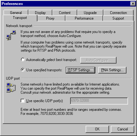MailGate Support Issues Q. How do I set up MailGate to proxy RealPlayer G2 A. MailGate provides a built in proxy for use with RealPlayer. Warning - Enabling Real Player to run in the System tray could initiate unwanted proxy connections. With a dial-up connection this could lead to some large phone bills. Proxy requirements - RealPlayer connects through MailGate using the Realtime AV protocol. It also requires DNS access through the DNS relay option Realtime AV proxy In MailGate, click on Gateway|Setup, and select the Realtime AV tab. Check the "Enable..." box. RealPlayer setup In the RealPlayer application on the client machine, click Options|Preferences and select the Connection tab. Set the normal and maximum bandwidth to suit your LAN. ![]() ...next, select the proxy tab, and configure as below (entering the IP address of the MailGate machine in the fields containing '192.168.1.1'): ![]() ...next, select the Transport tab, select "Use specified transports"... ![]() ...click the RTSP Settings button, and configure as below: ![]() ...click OK, then click the PNA Settings button, and configure as below: ![]() |